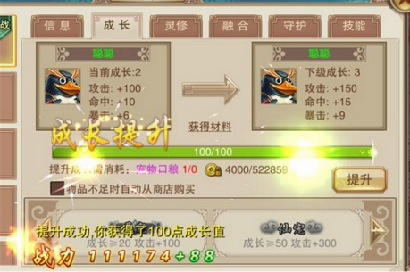 1、消耗道具宠物口粮可提升宠物成长经验值,经验值达到100时,成长等级提升一个等级。提升成长等级,可增加宠物的攻击、命中以及暴击。