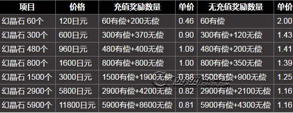 另外有月卡可以购买,包括300有偿石+3000无偿石(每天给100),价格600日元(单价0.18)。
