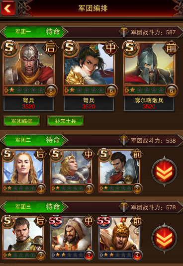 每位玩家会有很多军团,军团并不是越多越好,战斗力集中才是王道。一味的堆砌兵种可能会导致自己的军队战斗力很低。
