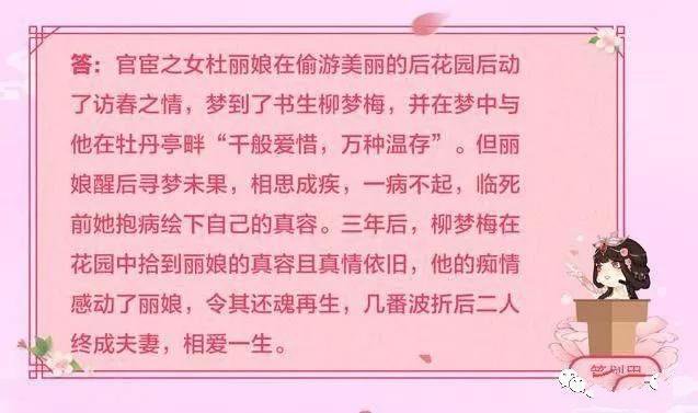 游园惊梦的主人公杜丽娘,做梦居然梦见了柳梦梅,还TM一见钟情。醒来后,她居然如此单纯的去寻找他,最后没有找到,相思病犯了,在临终前画下自己单纯可爱美丽动人的倾世容颜。几年后,他又如此的巧合路过花园,捡到了她的画像(三年也没腐烂?这个画像估计是石头雕出来的),他依旧是那么的喜欢她,因为痴情而感动了她,杜丽娘居然还魂了(诈尸三年),最终他们快了幸福的生活在一起了。