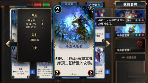 暗裔破坏者2-3-2:战吼:目标玩家将其牌库顶的三张牌置入坟场。