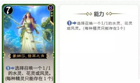 主动技能:1→选择召唤一个1/1的水灵、花灵或风灵。(每种精灵只能存在1个)非常灵活的效果,水灵、花灵、风灵效果各不同。