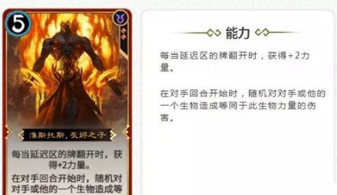 效果:“每当延迟区的牌翻开时,获得+2力量。在对手回合开始时,随机对对手或他的一个生物造成等同于此生物力量的伤害”