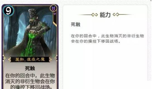 拥有【死触】效果,谁碰谁死!“在你的回合中,此生物消灭的非衍生物会在你的操控下移回战场。”至少白送一张【心灵操控】。