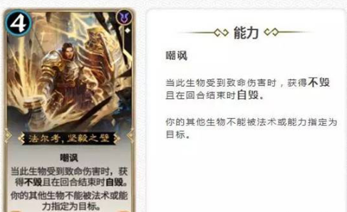 但效果惊人!【嘲讽】并具有【不毁】属性,“当此生物受到致命伤害时,获得不毁且在回合结束时自毁。你的其他生物不能被法术或能力指定为目标。”