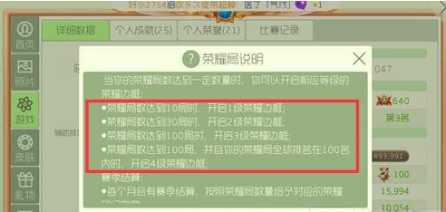 荣耀局数达到100局时,并且你的荣耀局全球排名在100名内,开启4级荣耀边框。