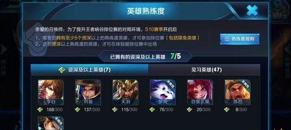 上图就是王者荣耀中的熟练度查看界面,上面明确提出:S10赛季,必须拥有5个资深以上的熟练度英雄,才能参与排位,同时排位也不允许资深熟练度以下的英雄参与。当然这个资深熟练度比较简单,随随便便打几把就够了,不过这样强制限制,可以避免玩家在排位中练习新买英雄。