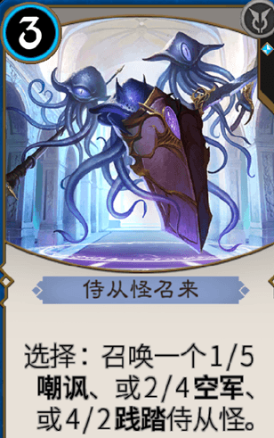 侍从怪召来是秘境对决中的蓝色法术卡,3费可以选择召唤一种生物,包括1/5的嘲讽、2/4的空军和4/2的践踏,既可以护脸也可以抢血,用起来比较灵活。