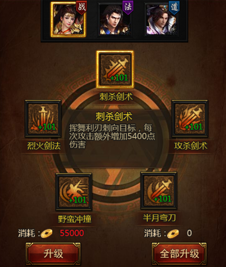 (2)战士技能:基础剑术、刺杀剑术、半月弯刀、野蛮冲撞、烈火剑法。