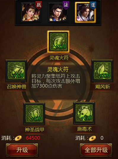 ① 灵魂火符:将灵力聚集纸符上攻击目标,每次攻击额外增加20点伤害。