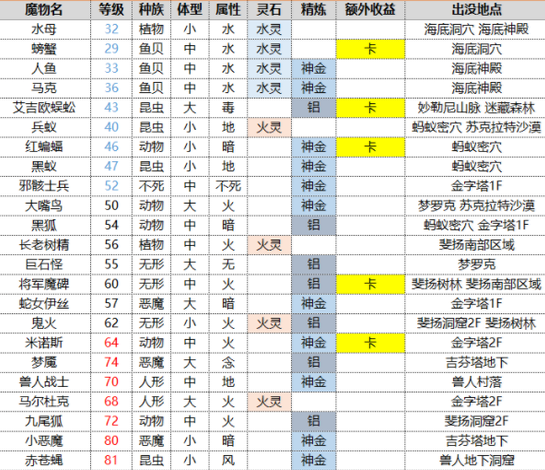 通过拍照记录怪物属性,我们可以找到掉落水灵原石、火灵原石、神金原石、铝原石的怪。我找出后列出来如下: