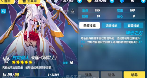卡莲颂歌上的属性不错,满级可以提升109的攻击,61的防御稍低,在深渊中会漏气,但上位作为输出圣痕,攻击还是最首要的。