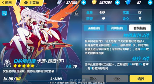 场上的敌人每有1个有脆弱,就为自己增加攻速和暴击伤害,最多叠加4次,最高可以提升24%的攻速和20%的暴击伤害,攻速提升最有价值的除了板鸭姬子就是德丽莎了,而暴击伤害的提升范围就光的多,只要不是纯元素伤,基本上都有用。