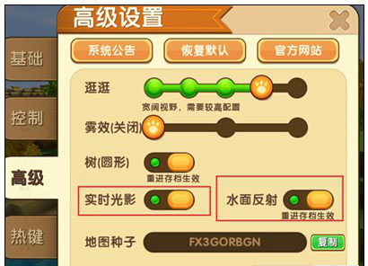 光影特效在【高级设置】中(实时光影、水面反射)能打开,开启后需要重新进入存档才能生效,也就是说开启之后你要先退出一次然后再进入存档。
