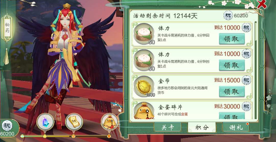 剧情关卡中可以获得金币、妖晶、金色精魄、休憩日积分。奖励数量随着通过的关卡数提升,通过的关卡越多,奖励丰富。