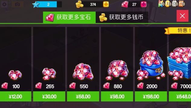 1、可通过充值获得,充值价位有:12、30、68、98、198、648宝石哦!