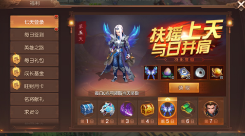 三日登录,赠送无级别强力武器。连续五日和七日登录,更可获得高贵华丽的空灵翅膀装饰和三国第一战神吕布!