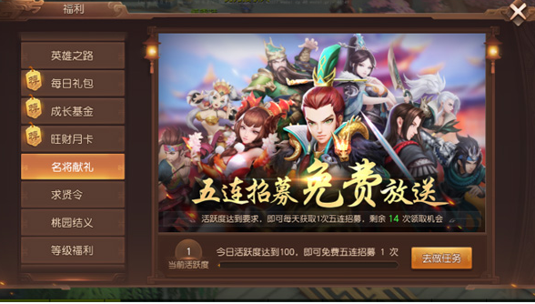 玩家当日活跃度达到100,即可每天获取1次五连招募机会,共可领取14次五连招募机会,有机会将70位武将纳入麾下,助您三国征战!