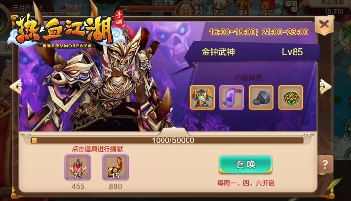 挑战魔王有机会获得对应等级的橙色装备和多种珍贵道具,进行捐献还可获得相应的帮贡。捐献道具可通过试炼地下宝藏和特殊活动获得。