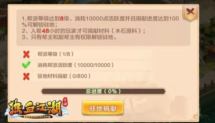驻地除了帮派等级达到8级,消耗一定的帮派活跃度外,还需要帮派各位成员的慷慨捐献才可解锁~