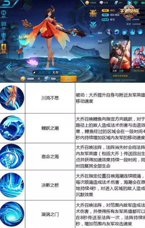 拥有很强调度作用的大乔,在游戏中主要是运用大招来迅速集结分布在峡谷不同位置的英雄,2技能更可以破掉一些难缠的硬控。大招和2技能配合使用团战可以打出不错的效果。但是要注意放2技能的地方,不要打着打着团把满血的队友送回家哦~