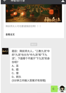 神都夜行录10月16日每日一题是:三教九流中的九流分为中九流和下九流,下面哪个不属于下九流身份,答对每日一题可以获得积分奖励,那么神都夜行录不属于下九流身份的是什么,西西带来10月16日每日一题介绍,希望对大家有所帮助。