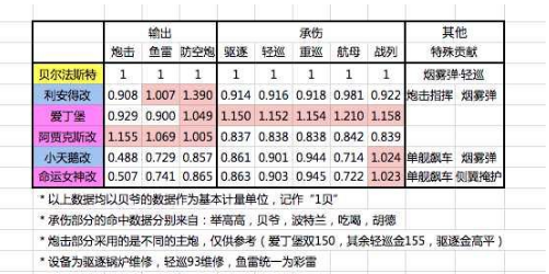 从图中可以看出来,利安得的身板比贝爷脆一点,鱼雷伤害十分接近,防空炮伤害大大超出。并且可以buff前排的巡洋舰以及和贝爷搭配完成双拉烟的操作。