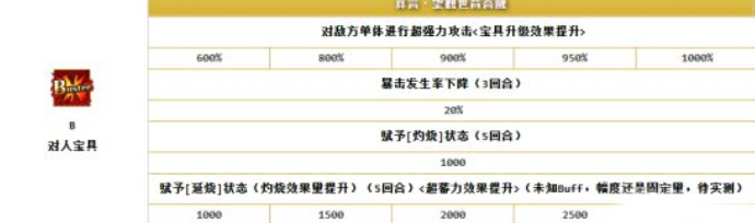标准倍率的红卡单体宝具,副效果为灼伤状态,看上去只有1000,但是随便烧上几个回合还是非常疼的。至于那个延烧的具体效果还有待测试。