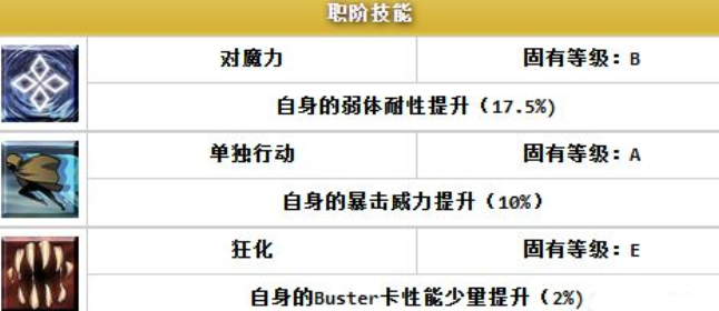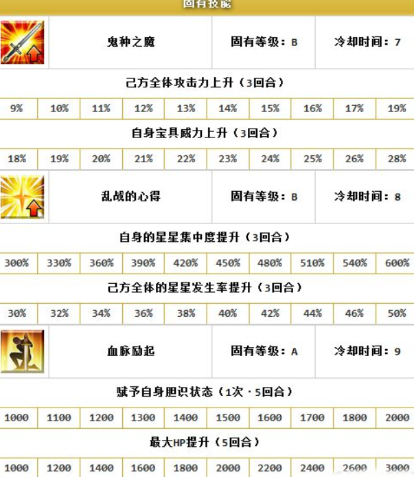 一技能满级5回合CD,持续3回合,当做常驻的buff也是可以,相比茨木的同名技能不知道为什么低了1%攻击和2%宝具威力。配合自身比较高的白值和2%的红卡,宝具威力还是不错的。