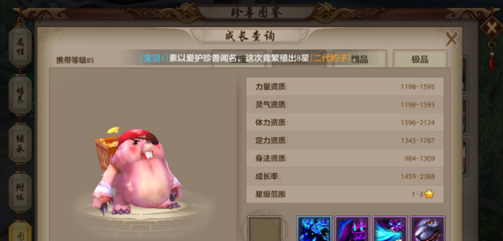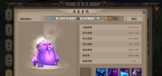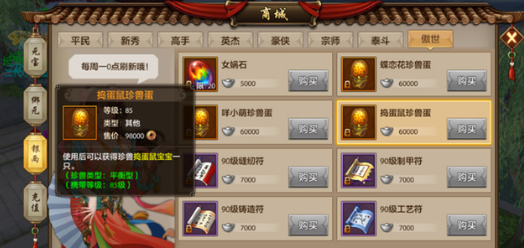 在少侠通关英雄试炼雄霸一方之后,可以在银两商城花费6万银两购买捣蛋鼠珍兽蛋。完美捣蛋鼠的成长资质为2388,比75珍兽高出350点。另外85的捣蛋鼠比同星级的神猿各类资质都要高出100-250点。