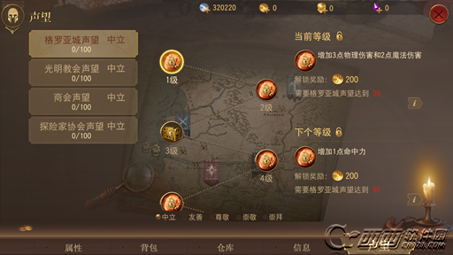 声望分为格罗亚城声望,光明教会声望,商会声望和探险家协会声望