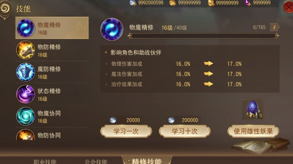 精修技能对于提升玩家的战斗力非常重要。玩家可以使用道具“雄性妖果”和“雌性妖果”,或者消耗银币进行精修技能提升。精修技能的上限等级,受到公会等级和玩家历史公会贡献的影响。