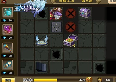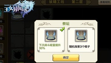 宝箱可以开出物品奖励;遇到神秘商人可以用少量精灵币购买物品;探索出祭坛则可以随机的获得两个增益效果,可根据王女的情况选择其中一个使用。