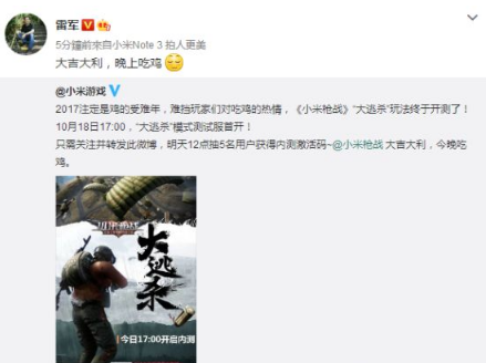 雷军也转发了这条微博,还配上了“大吉大利,晚上吃鸡”的博文,这波吃鸡的热度蹭得可以。