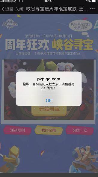峡谷夺宝活动中获得150个祝福值才可以进行兑换,而每个账号每天最多可以挖掘5次,帮助朋友开启5次。本以为这样相安无事,但是今日很多王者荣耀玩家们纷纷表示峡谷寻宝进不去了,可以帮助他人开启宝藏没有限制!一天可以帮无数人开无数个宝藏!同理别人也可以帮你开宝藏!那么永久皮肤不是很快就能开启了吗?