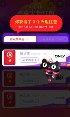 稀有红包:点亮后,可以最高获得111元的火炬红包,开奖时揭晓。