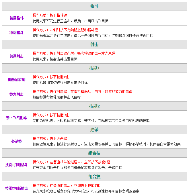 搭载着“零式系统”的飞翼高达零式拥有全面的进攻手段。主射击武器双管爆裂步枪单发优势明显,威力较高,并且残弹多达六发,妥善使用就能占有先机。技能1机关加农炮在射击时有较大硬直,但是防御性能较好,建议在转换进攻节奏的间隙中使用。飞翼高达零式还拥有较强的普通格斗连段与冲刺格斗,在近距离也不会落入下风。另外一大特点就是可以变形为MA飞鸟形态,瞬间改换高速巡航状态让此机体的战术打法更为多变。标志性的MAP武器自然不能少,充能技能就能还原动画中双手持枪环状照射的动作,此招可攻击复数的目标,威力和观赏性皆有兼顾;觉醒技能就是动画最终话舍命一击的双管爆裂步枪全功率发射,长时间高威力射线武器不用想都知道厉害至极,不愧是W系列最强的机体啊。