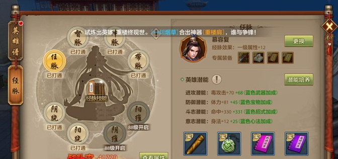 好感度等级达到30级的英雄可以帮助少侠打通八大经脉,好感度等级越高,打通经脉的效果就越好,提供的战斗力也就越高,不同的英雄提供不同的属性,提供的经脉效果也各不相同。英雄有绿卡、蓝卡、紫卡、橙卡等不同等级,等级越高的英雄,提供的属性加成越多,以橙色为佳。对于丐帮而言,在相同卡片的基础上要把体力、一级属性和毒攻击作为优先选择的对象,因为这些属性给丐帮提供的加成很丰厚。举例说明一下,王语嫣和慕容复都是橙色卡,但他们提供的属性分别是命中和一级属性。一级属性优先于命中,选择打通经脉的英雄就应该是慕容复。在紫卡和橙卡之间要优先考虑选择橙色卡片。比如紫卡阿朱提供一级属性,而橙卡王语嫣提供命中,在她们之间选择时就要优先王语嫣了。总结下来就是优先橙色英雄,英雄选好了再看他们的属性,丐帮以体力优先。