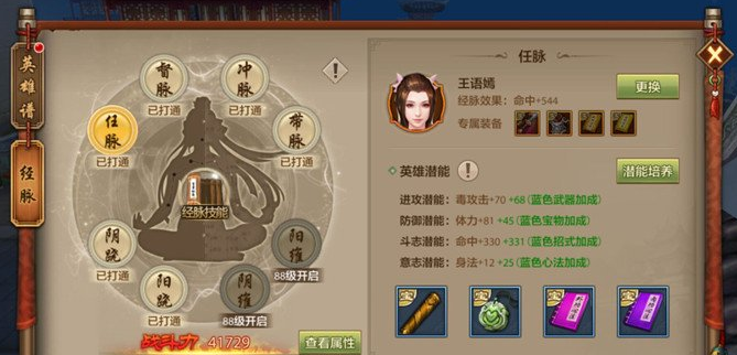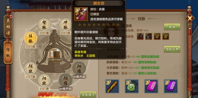 英雄有武器、宝物、招式和心法四个装备。装备分白、绿、蓝、紫和橙五种品质。值得注意的是,英雄穿戴了装备可以激发潜能,品质越高效果就越好,所以尽量选择橙色的装备。另外每个英雄都有自己的专属装备,如果穿戴专属装备还会获得额外的潜能加成。总之,在装备的选择上以专属装备为首选,次之为橙色装备。以王语嫣为例,她优先选择的装备就是越女剑、软猬甲、参合指和玉女心经。暂时没有得到的情况下,就在橙、紫、蓝、绿和白几种品质中渐次选择。