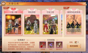 旅途漫漫,神仙眷侣总令众生艳羡。共赴奇途绝境,同战异类妖邪,生死与共方是夫妻同心。夫妻任务,共有三大系列任务、日常任务和三生石玩法。
