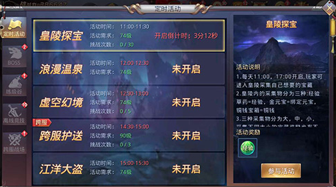 皇陵探宝在定时活动中可以看到,这样劲爆的活动每一天竟然开启两场,11点与17点准时探宝,开启活动还需要人物达到74级以上。有上述条件之后各位道友就可以进入皇陵,探索属于你的皇家宝藏了!