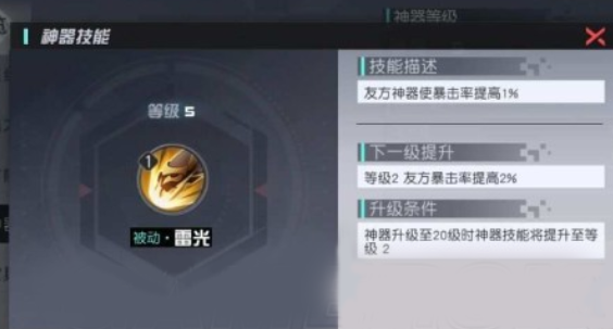 神器升级至20级时神器技能将提升至等级2。