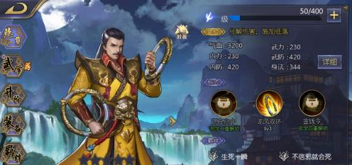 2、金钱令:触发低落状态,目标无法获得怒气,持续2回合。普攻有概率释放金钱令,造成武力x100%的伤害。
