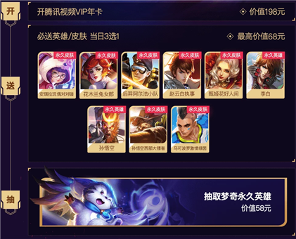 2、必送英雄/皮肤当日3选1最高价值68元