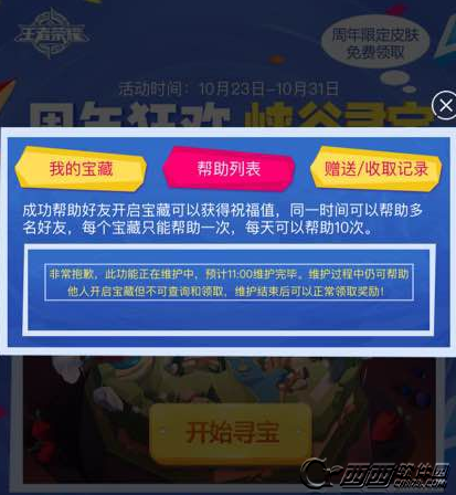 峡谷寻宝帮助列表功能正在维护当中,预计11点维护完毕,维护过程中可以帮助他人开启宝藏,但不能够查询和领取