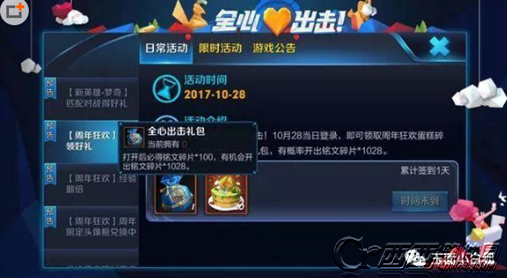 10月28日当天登录,可以领取全心出击礼包一份,可开出1028铭文碎片。这个礼包的概率也不算太低,之前开出1028钻石的玩家不在少数,所以大家不要那么悲观,起码有个安慰奖100铭文碎片+4个皮肤碎片(蛋糕碎片兑换“者”字礼包)。