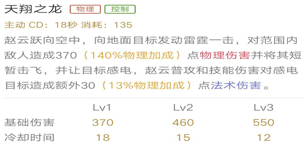 整体分析:是赵云的主要控制技能和位移技能,命中敌人带有击飞和感电效果,对于感电状态的敌人,赵云的普攻和技能都会对目标造成额外法术伤害。有短暂前摇,范围较小,需要一定的预判,大招能否命中敌人,是决定赵云输出的关键。赵云可利用大招先手开团,一技能接近敌方后排后,大招击飞后排,配合强化普攻和2技能,能打出高额伤害。