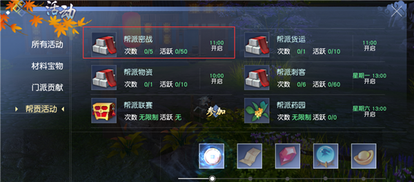 点击主界面右上角的“活动”图标进入功能界面,点击“帮派密战”图标进入活动介绍界面,报名参加。