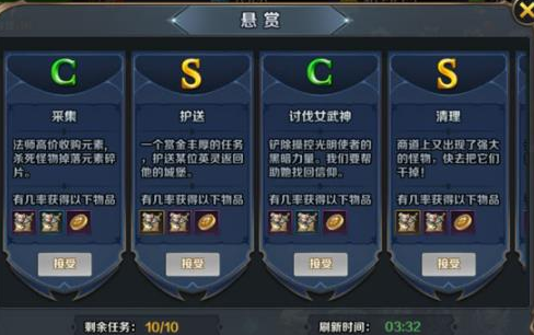 游戏每隔一定时间发布一次新的悬赏任务,供玩家进行抢夺。其中五种难度相对于任务总数的比例是固定的,难度越高的任务越少。玩家领取任务之后,立即被添加到主界面的任务栏里,点击弹出如下界面。