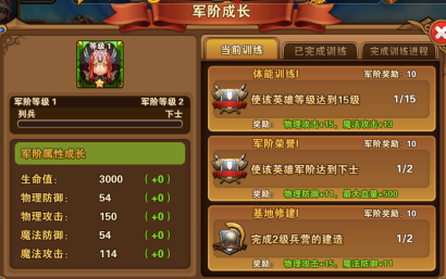 我们最先接触到提升英雄能力的就是军阶成长--增强英雄属性。而军阶的成长是需要完成训练任务才能提升。所以,我们在做任务、闯关和活动的时候,不要忘记先打开:酒馆→英雄军阶→当前训练,查看我们可以完成的训练任务是什么。这样我们既能结合训练任务又能做日常任务、闯关和活动,何乐而不为呢?正所谓一石三四鸟呀( ⊙ o ⊙ )!